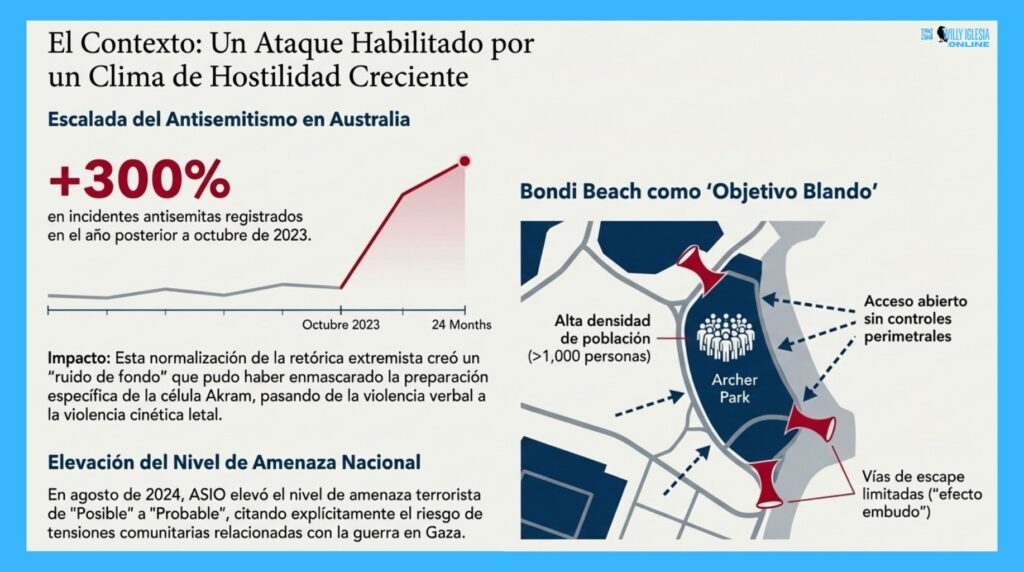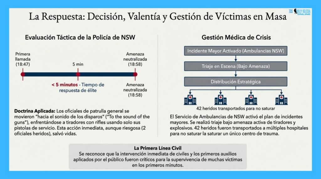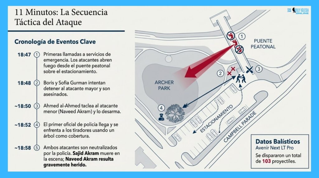- La Táctica: Los tiradores abrieron fuego contra las familias reunidas para el encendido de la menorá. La geografía del parque, acotada por la playa y la infraestructura urbana, creó un «efecto embudo» que limitó las vías de escape, maximizando la efectividad del fuego.