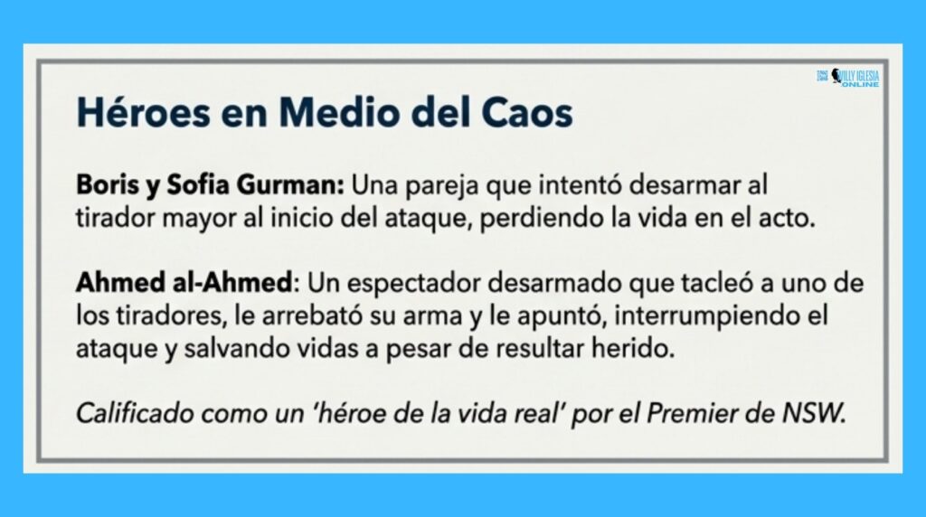 - El Héroe Civil: Ahmed al-Ahmed, un ciudadano presente en el lugar, logró placar y desarmar parcialmente a uno de los atacantes (Naveed), interrumpiendo su ciclo de fuego y salvando incontables vidas antes de la llegada de la policía.