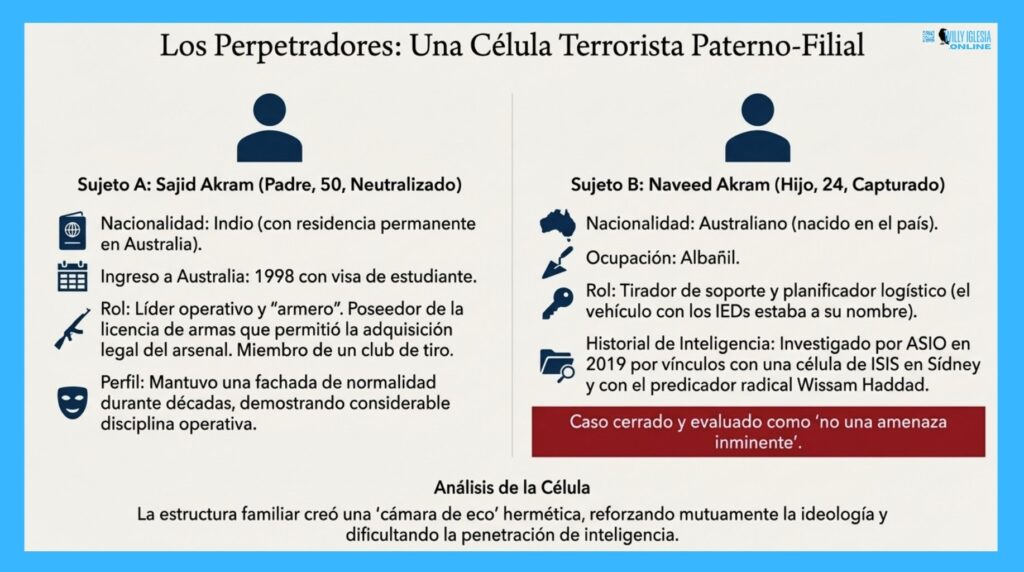 Los responsables han sido identificados como Sajid Akram (50 años, abatido en la escena) y su hijo Naveed Akram (24 años, capturado y hospitalizado). La dinámica de esta «célula familiar cerrada» fue clave para eludir la detección de inteligencia humana (HUMINT).