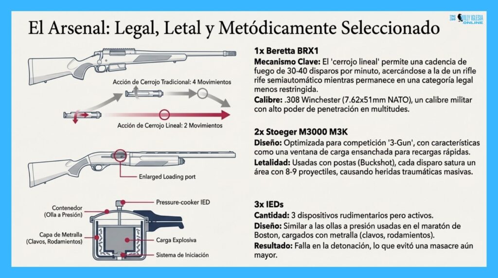 - IEDs Fallidos: Se hallaron explosivos tipo olla a presión en el vehículo de los sospechosos que, por un fallo técnico, no detonaron, evitando una masacre aún mayor.