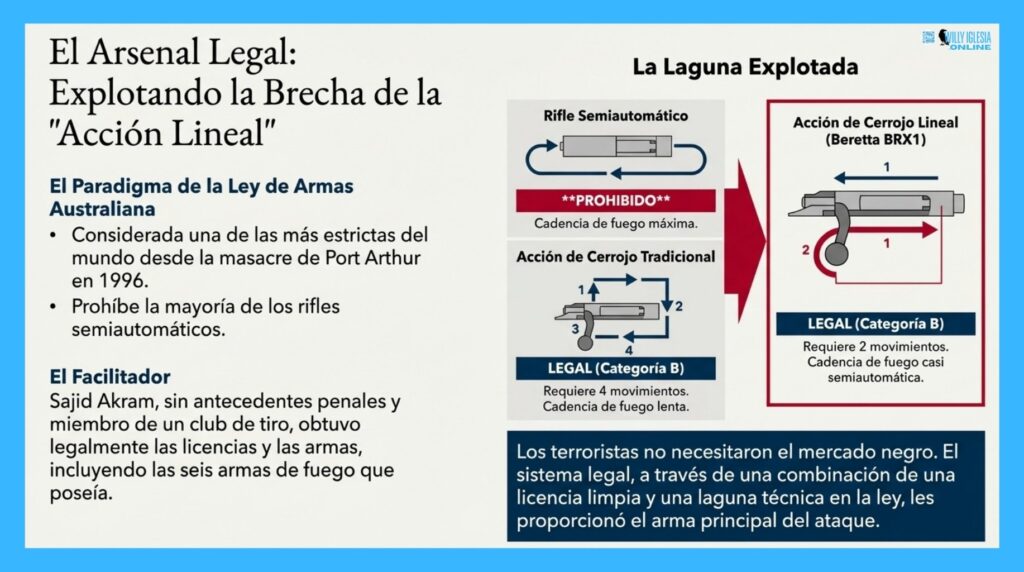 El armamento utilizado revela una planificación sofisticada para explotar la normativa australiana vigente:
